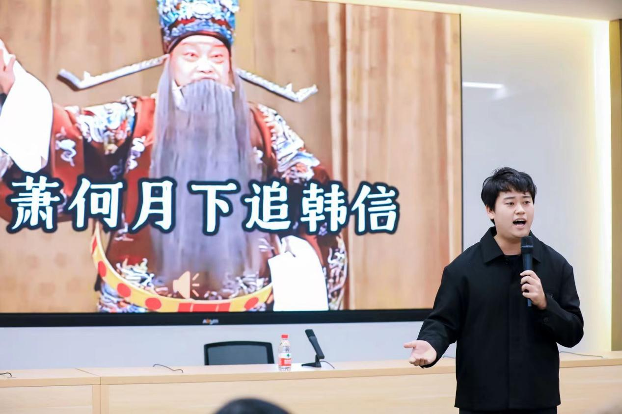 买球官方网站2023级本科生表演了精彩的节目。王英昊同学演唱了京剧段《萧何月下追韩信》,唱腔高亢嘹亮,赢得了阵阵掌声。