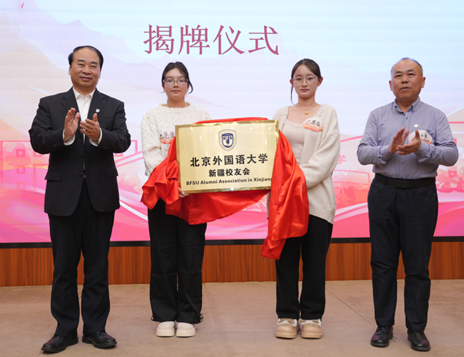 在校友们的共同见证下,大会现场举行了北外校友会新疆分会的揭牌仪式。