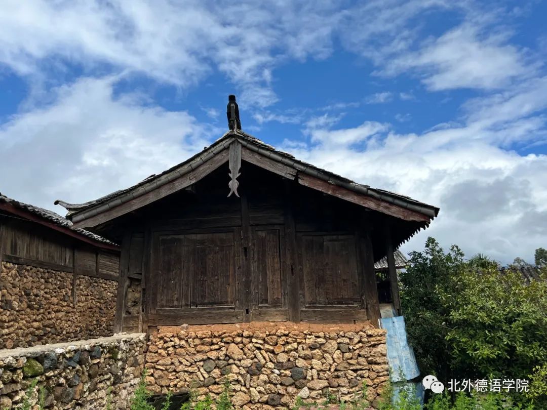 纳西族聚居的村落家家户户房檐下悬挂着木鱼,别具特色。实践团成员经询问了解到,当地民居主要以木质结构建筑为主,根据五行相生相克的学说:水克火,火克木,鱼为水中之物,悬鱼有使民居免受火烧之灾的寓意。此外,“鲤”通“利”,悬鱼还有着财源茂盛、农业丰收、官运亨通等的祈财含义。作为纳西传统建筑装饰的代表之一,悬鱼还具备自身一定的实用性。雨水季节垂鱼能在一定程度上防止飘雨对木结构的伤害,起到防止木结构受损的作用。