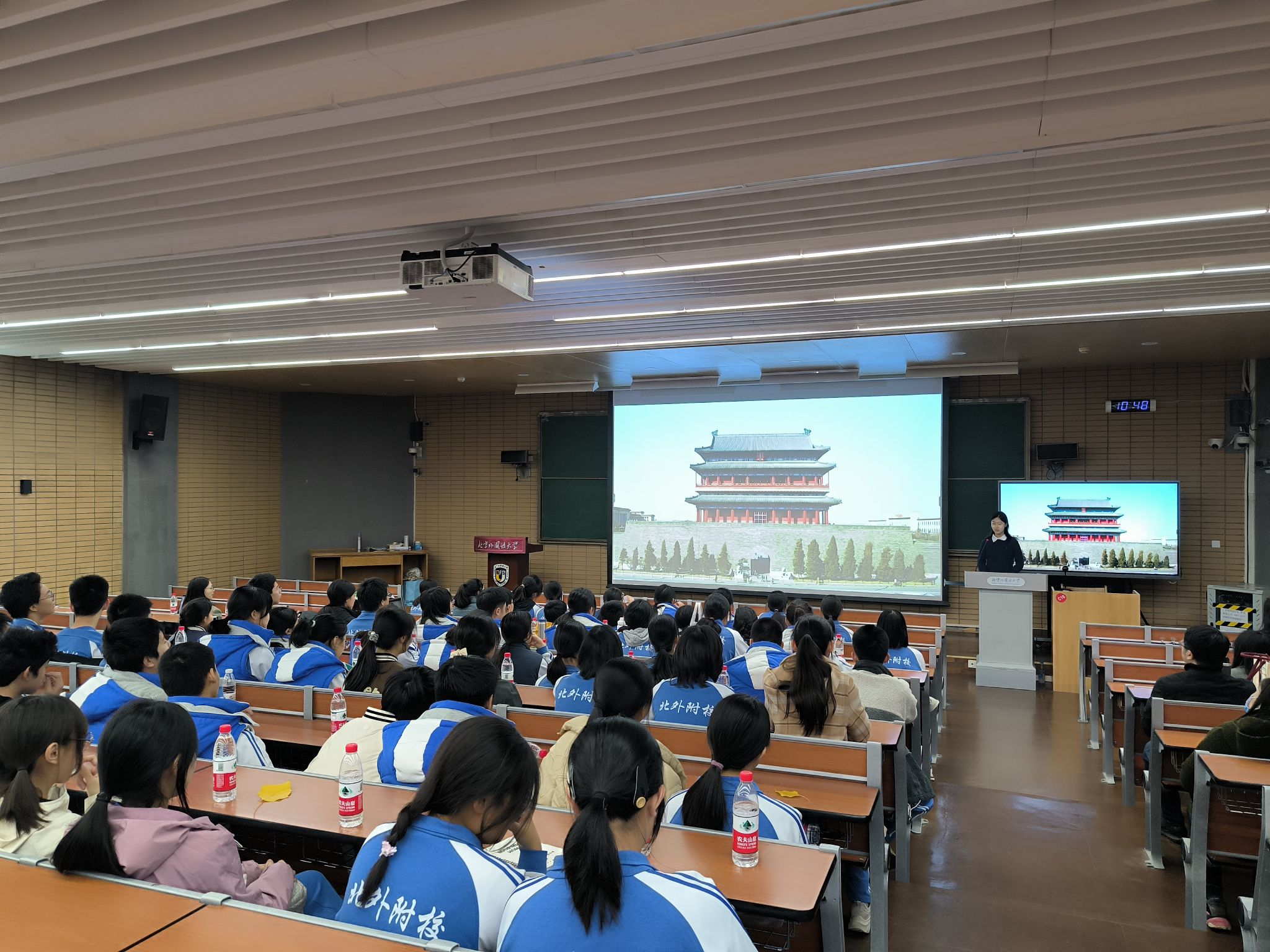 11月8日北外附校副校长、初中部党支部书记杨磊带队师生80人来访买球官方网站,买球官方网站党总支组织员张春霞,本科党支部罗惠心、熊菁华、田韵熙、郑瑞丹、张淡然,博士周濛濛、研究生张鸣天等人参与接待。先后陪同师生参观北外校史馆、语言博物馆、“拉贝与中国”主题展、北外人工智能实验室、图书馆等。在逸夫楼一阶罗惠心、熊菁华、田韵熙向来访师生介绍了大学生创新创业项目:北京中轴线研究、非遗皮影多语种传播、非遗苗喵秀多语种推广,向广大中学生介绍大学生如何开展科研创新研究,并运用语言来讲好中国故事,传播中国博大精深的传统文化。