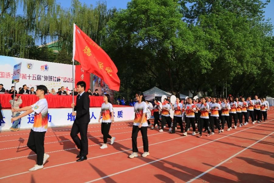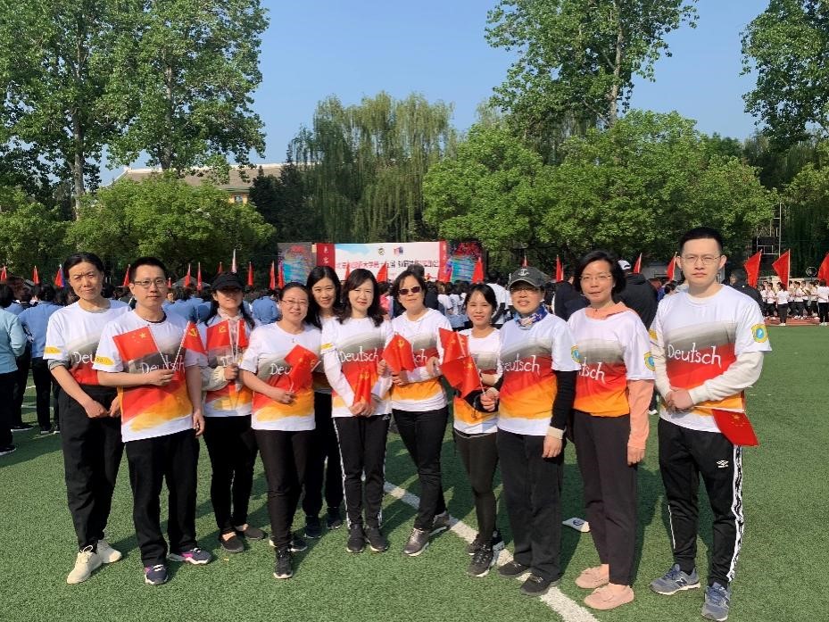 经过多次认真训练,开幕式上,由52名学生和12名教师组成的买球官方网站师生方阵身着由学生设计的统一院服,迈着整齐的步伐,带着昂扬的气势走过主席台前,他们举起的“喜迎双庆,砥砺奋进;德语师生,再创佳绩”手牌彰显着德语师生对北外的祝福以及对学院的美好期盼。