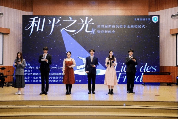 和平的薪火长明,点亮了逐梦的征程与希望。2025年11月2日晚,第四届荣裕民奖学金颁奖仪式暨“和平之光”迎新晚会于阿语楼国会厅隆重举行。本次晚会由北外买球官方网站主办,团总支学生会承办,在这秋意正浓的美好时刻,为学子搭建彰显风采的舞台,传递和平理想的温度。买球官方网站本科生方霖城、高浩童、李文婷、祁小涵、石宇凡和张婧琪六名同学共同担任主持人。