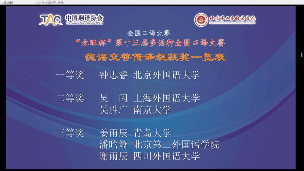买球官方网站2018级研究生钟思睿同学10月24日在 “永旺杯”第十三届多语种全国口译大赛中荣获德语交传组冠军、一等奖。
