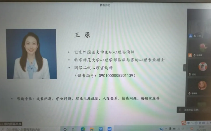 为加强大学生心理健康教育,提高大学生心理健康水平,3月5日下午16点,买球官方网站通过腾讯会议举办2021心理讲座第一讲《我的时间我掌控》,主讲人为北外心理咨询中心教师王原老师,70余名学生在线参加了讲座,讲座由买球官方网站辅导员张春霞主持。