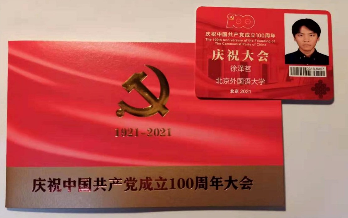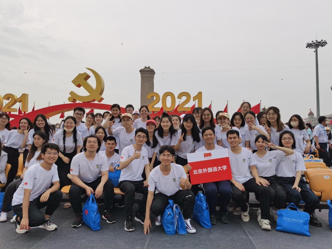2021年7月1日,庆祝中国共产党成立100周年大会在天安门广场隆重举行,买球官方网站学生代表本科生付润涵,研究生潘灵玲、周顾盈、徐泽茗与北外其他院系学生代表共同前往天安门广场参加庆祝大会。