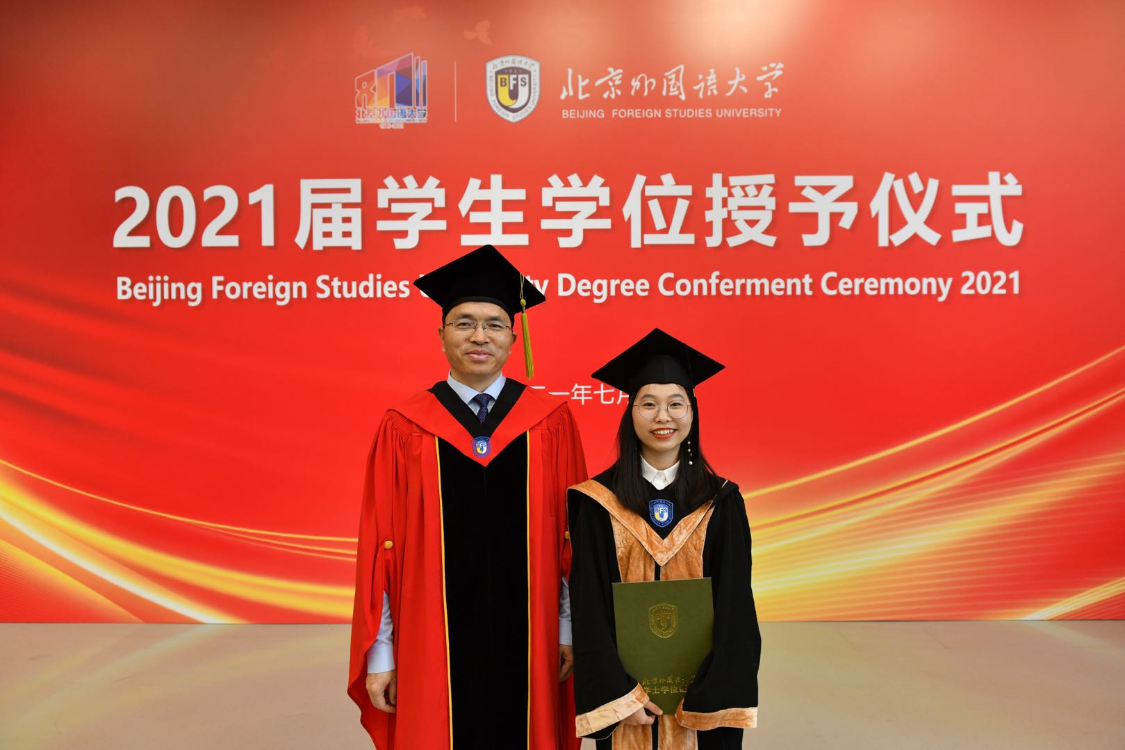 7月2日8:30点,时值中国共产党一百周年华诞和北外八十周年校庆之际,买球官方网站2021届学生毕业典礼于体育馆隆重举行。买球官方网站2021届毕业生和观礼教师代表齐聚典礼现场,共同聆听了校长杨丹教授、75级校友刘碧伟先生以及师生代表的致辞。随后,买球官方网站师生共同观摩了2021届毕业生代表学位授予仪式、优秀毕业生表彰仪式及第23届研究生支教团授旗仪式。典礼最后,全场深情合唱校歌,与大屏幕中的恩师、好友和自己挥手道别。