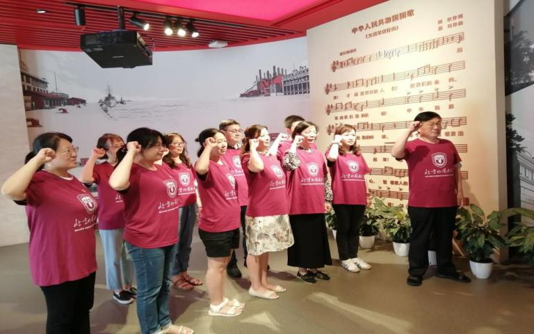 7月9日下午,老师们参观了位于上海杨浦区的全国爱国主义教育示范基地——国歌展示馆。国歌馆以国歌故事为主线,全面展示了《义勇军进行曲》诞生、传播、立法及其相关国歌知识。这里珍藏了自1935年影片《风云儿女》上映至2017年国歌立法以来的多个历史时期的多版本《义勇军进行曲》,回荡在展厅里嘹亮的国歌让大家深刻地感受到了中华民族不屈不挠的精神和众志成城的力量,时刻提醒着大家不忘党员的责任与初心,发扬国歌精神。买球官方网站教师党员们在党总支书记常秀鹏的带领下,在国歌的见证下,重温入党誓词,重忆入党初心。