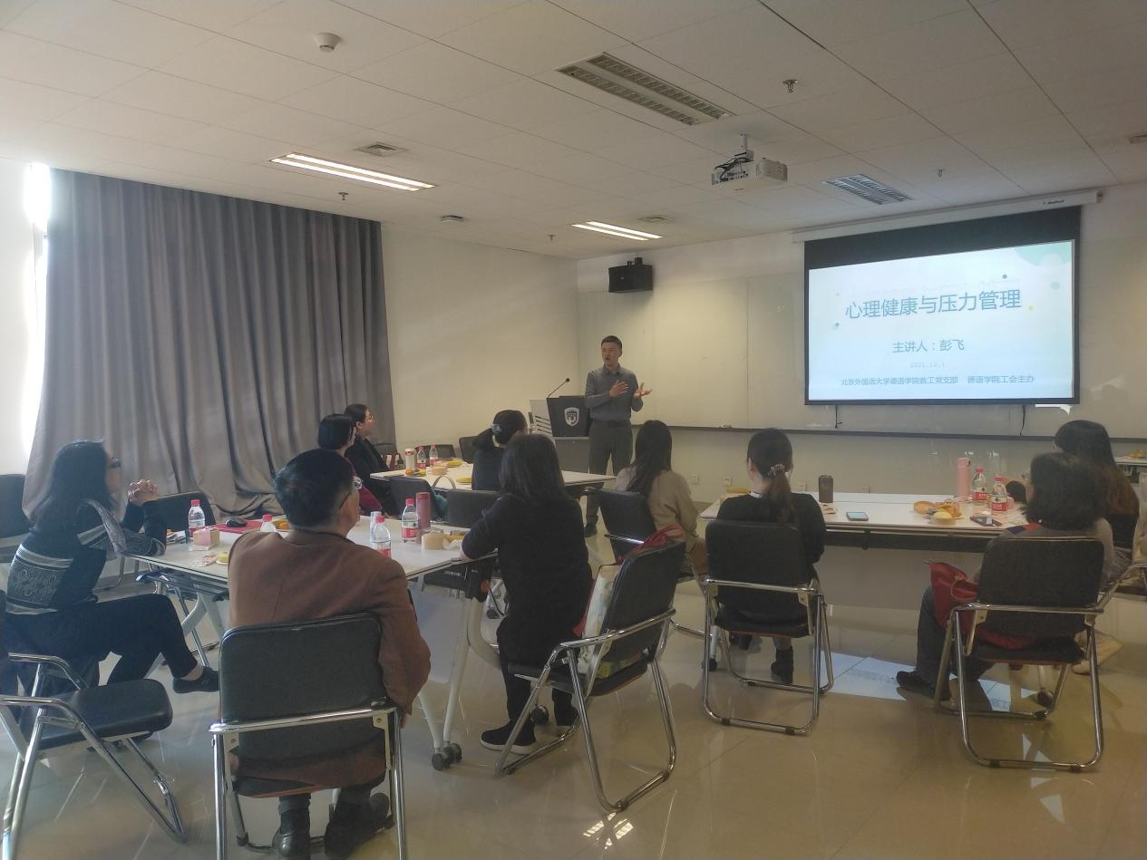 为增强教师对心理知识的了解,提升教师的心理健康水平,买球官方网站教师党支部、买球官方网站工会于12月1日13点至15点,在国际大厦1053会议室,联合举办教师“心理健康与压力管理”团体活动。北外心理咨询中心咨询师、国家二级心理咨询师彭飞为老师们讲授维护心理健康和缓解压力的知识。