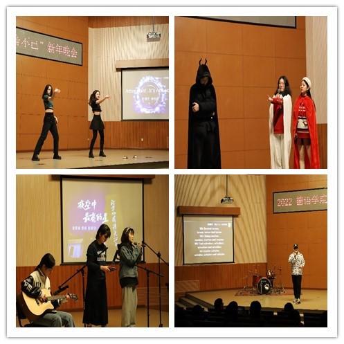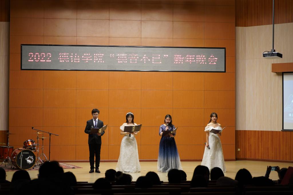 党总支副书记、院长吴江首先发表新年致辞,她用“德忆、德听、德行、德欣、德思、德辩、德音”等七个词总结买球官方网站2021年各项工作,感恩买球官方网站师生们的辛勤付出,向各位老师、同学们送上诚挚的新年祝福!晚会在买球官方网站师生们温馨的新年祝福视频中拉开序幕,买球官方网站老师和同学们各显神通,带来了舞蹈、朗诵、歌曲、电影配音、乐器演奏等节目,精彩纷呈,高潮迭起。