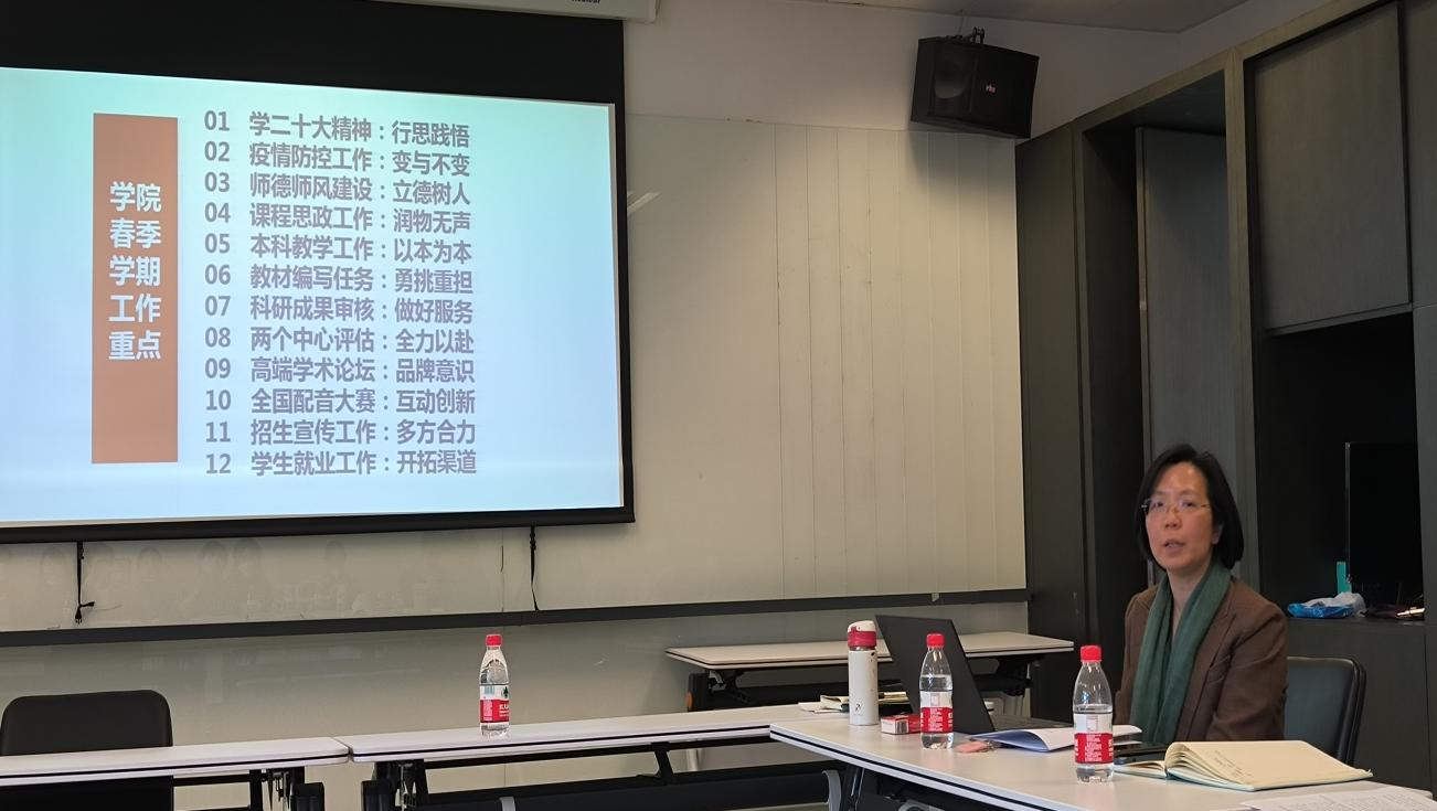 吴江回顾总结了秋季学期买球官方网站在疫情防控、教学科研、学生培养、管理保障等方面工作取得的成效,感谢了专业教师、管理干部为学院发展所作的贡献。从十二个方面部署了学院春季学期的工作重点,要围绕“行思践悟”深入学习二十大精神,疫情防控工作处理好“变与不变”,落实“立德树人”狠抓师德师风建设,研究“润物无声”开展课程思政工作,坚持“以本为本”,做好本科教学工作,“勇挑重担”完成教材编写任务,“做好服务”完成科研成果审核,“全力以赴”开展两个中心的评估工作,秉承“互动创新”办好第五届全国高校本科生德语配音大赛,树立“品牌意识”筹备好第二届德语学科区域国别研究高端学术论坛,“多方合力”做好招生宣传工作,“开拓渠道”助力学生就业工作。