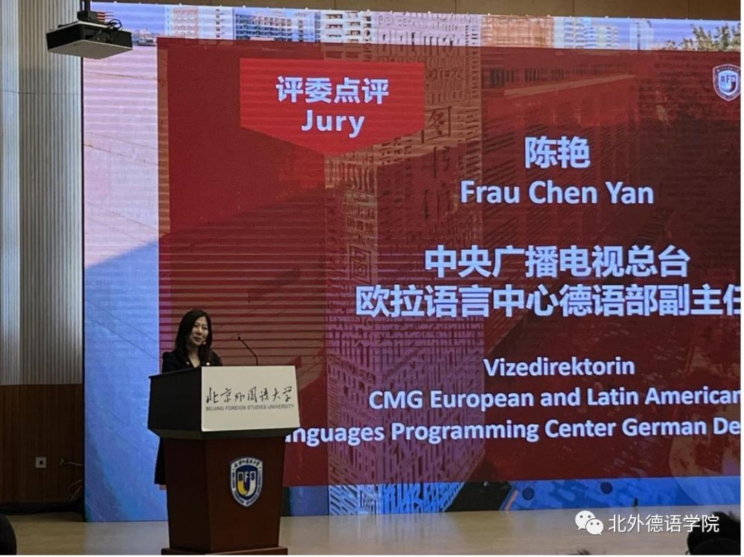 本届大赛决赛邀请了贾建新参赞、北外山东校友会会长、青岛鸿裕吉交通装备有限公司总经理秦思刚、中央广播电视总台欧拉语言中心德语部副主任陈艳以及中国网德语频道主编任斌担任评委。赛事环节由买球官方网站2019级本科生曹涵和2022级本科生黄婉茹用中德双语主持。