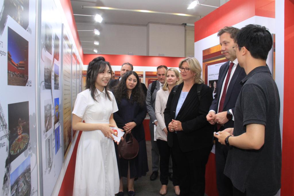 2023年,团队成功接待德国社民党联合主席克林贝尔一行、中国政府友谊奖获得者托马斯·拉贝一行、德国华为数字种子项目成员等,用流利的外语与外宾交流北京中轴线的“中和”思想。与此同时,团队结合前两年社会实践相关经历,完成学术报告《跨越中轴线:基于北京中轴文化形象的对外话语体系研究》。报告基于深度访谈与语料库辅助的媒体形象建构,研究中德媒体关于北京中轴文化形象的新闻报道,探析北京中轴线在传播过程中存在的问题、原因及改进方法,获第十八届“挑战杯”大学生课外学术科技作品竞赛全国铜奖以及北京市特等奖。报告第一作者、团队负责人黄徐洋于2023年7月代表北外前往清华大学参加2023年全国大学生“三下乡”“返家乡”首都新时代大学生社会实践成果交流展,现场展示团队国际交流成果,吸引众多高校师生驻足。