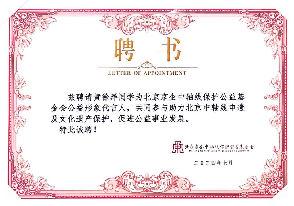 决赛现场,黄徐洋以“话中轴·语世界”为题,生动讲述了三年来依托北京中轴线文化传承活动,项目从国内到国际、从实践到学术、从“中轴线的智慧”到“跨越中轴线”的发展历程,以及个人从讲“中轴线的故事”到“我与中轴线的故事”的成长心路。在团队一次次对外交流活动中,北京中轴线成为连接中外的桥梁,是其“中和”思想拉起了两国友人的手。青年学子多语展示、研究和传播北京中轴线文化的轨迹和故事,正是中轴文脉在新时代的延长。7月27日,黄徐洋获聘北京京企中轴线保护公益基金会公益形象代言人。