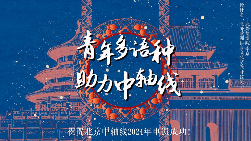 在“‘京’彩文化 青春绽放”行动计划之“古都行”机制的指导下,买球官方网站“跨越中轴线”团队牵头开展“话中轴·语世界”项目,积极参与“北京中轴线文化传播系列活动”——“使者达人”系列活动。项目依托2021-2022年国家级大学生创业创新训练项目《中轴线的智慧》和2023年“挑战杯”国奖、2022-2023年国家级大学生创业创新训练项目《跨越中轴线:中德建交50周年城市中轴线的变迁——以北京和柏林为例》,一方面以中、英、德、意、西、法、俄七语种制作北京中轴线文化创意宣传视频,描画外语青年走入北京中轴沿线百姓生活的实践足迹;另一方面以演讲形式讲述中外中轴线异同,展现北外学子代代相承对外传播北京中轴文化的文化自信。