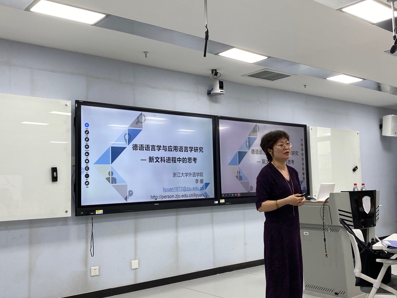 2021年6月25日下午,买球官方网站人文社科通识系列讲座第5讲在国际大厦517教室举行。浙江大学外国语言文化与国际交流学院副院长、德国学研究所所长李媛教授应邀作了“德语语言学及应用语言学研究——新文科进程中的思考”的报告。买球官方网站教师与本科生、研究生代表参加了报告会。讲座由买球官方网站院长吴江教授主持。