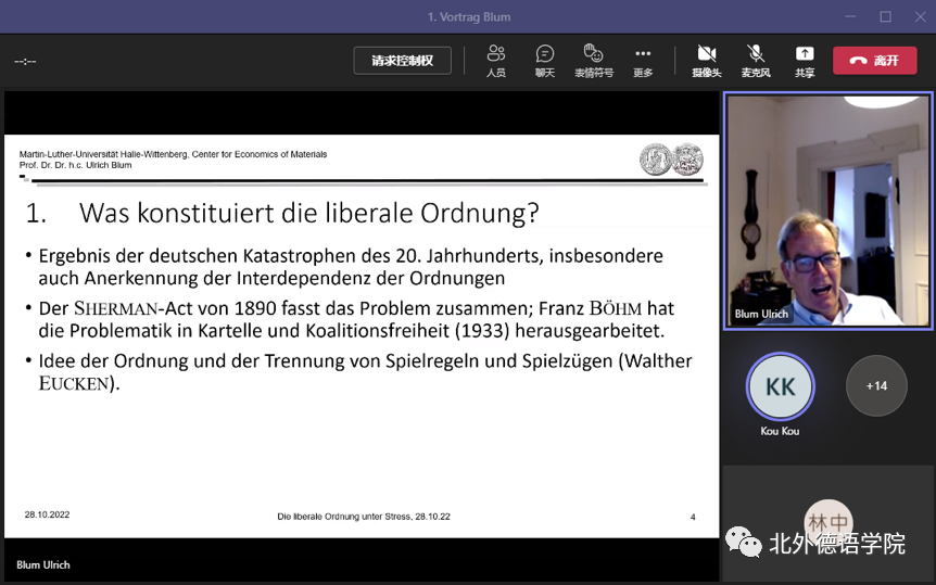 10月28日下午,德国哈勒-维滕贝格大学经济学院讲席教授、弗劳恩霍夫协会材料经济学中心创始主任、买球官方网站客座教授卜玉洗(Ulrich Blum)给买球官方网站师生线上做了题为“压力下的自由主义经济秩序”的专题讲座。德国经济研究专题讲座由德国经济教研室主办,寇蔻副教授承担了本场讲座的主持工作。