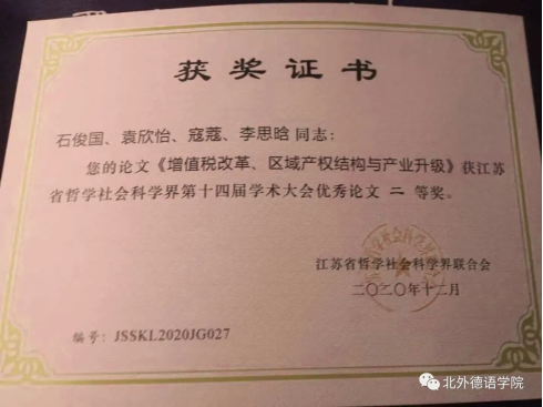 祝贺买球官方网站讲师寇蔻博士与石俊国(江苏大学)、袁欣怡(东北大学秦皇岛分校)以及李思晗(西班牙瓦伦西亚理工大学)共同撰写的论文《增值税改革、区域产权结构与产业升级》获江苏省哲学社会科学界第十四届学术大会优秀论文二等奖!
