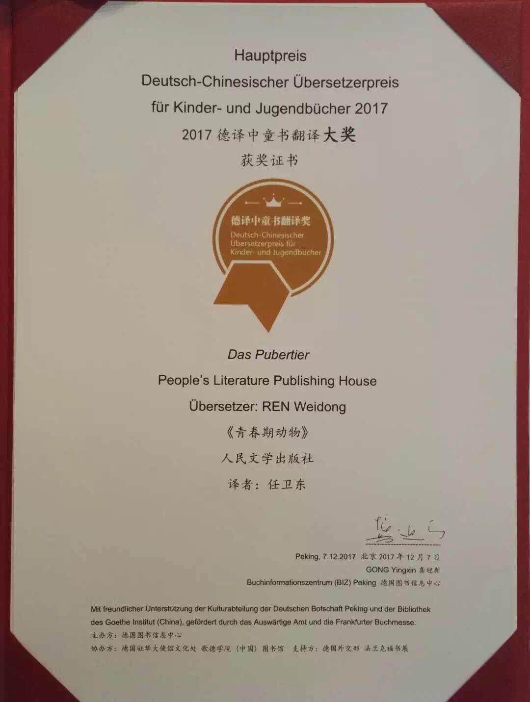 “德译中童书翻译奖”由德国图书信息中心主办,德国驻华大使馆文化处、歌德学院(中国)图书馆协办,获德国外交部及法兰克福书展支持。此次共用八名译者(译著)得奖,任卫东教授凭借译作《青春期动物》荣获唯一大奖。