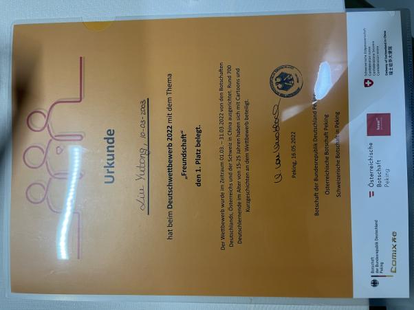 近日,由德国、奥地利和瑞士驻华大使馆联合主办的2022德语大赛圆满落幕。此次大赛以“友谊”为主题,来自全国各地近700名青少年德语学习者提交了短篇故事或漫画作品参赛。经过专业评审团的打分,买球官方网站2021级本科生刘禹彤的参赛作品“Anna und das Vöglein”凭借扎实的语言功底以及丰富的想象力获短篇故事类一等奖。