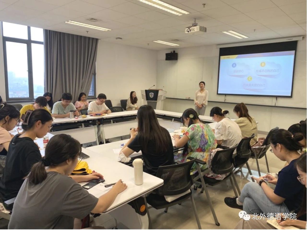宋巍老师以“学业适应”为主题,为硕士生介绍了获取学术资源、确定学术目标等方面的经验,之后带领同学们学习了压力管理理论,开展压力管理的团体活动。